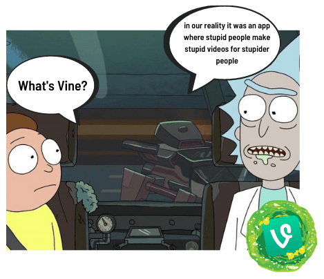 During 2016 an outbreak of murder hornets kept people indoors for the majority of the year which lead to Vine exploding in popularity.Six second podcasts, six second news articles and even six second meals became the norm. The world's attention span shrunk and Vine was there to expand into every market possible.The icing on the cake was the addition of lip-syncing to their platform which kicked off the next generation of musicians. A rival competitor ByteDance pivoted into the music licensing area - they're just doing okay.